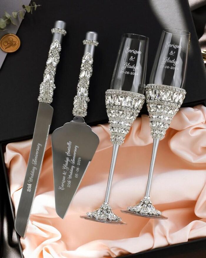 This personalized set is truly elegant! The rhinestones sparkle in the light, and everything was packaged so carefully. It made our cake-cutting ceremony extra special.