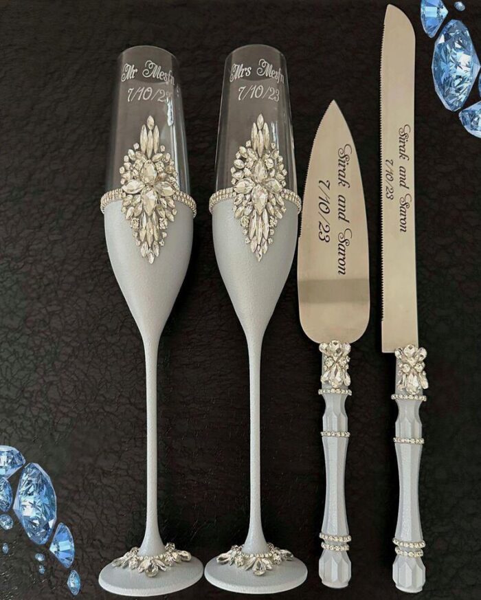 🥂 Includes 2 premium wine flutes, 1 knife, and 1 cake server