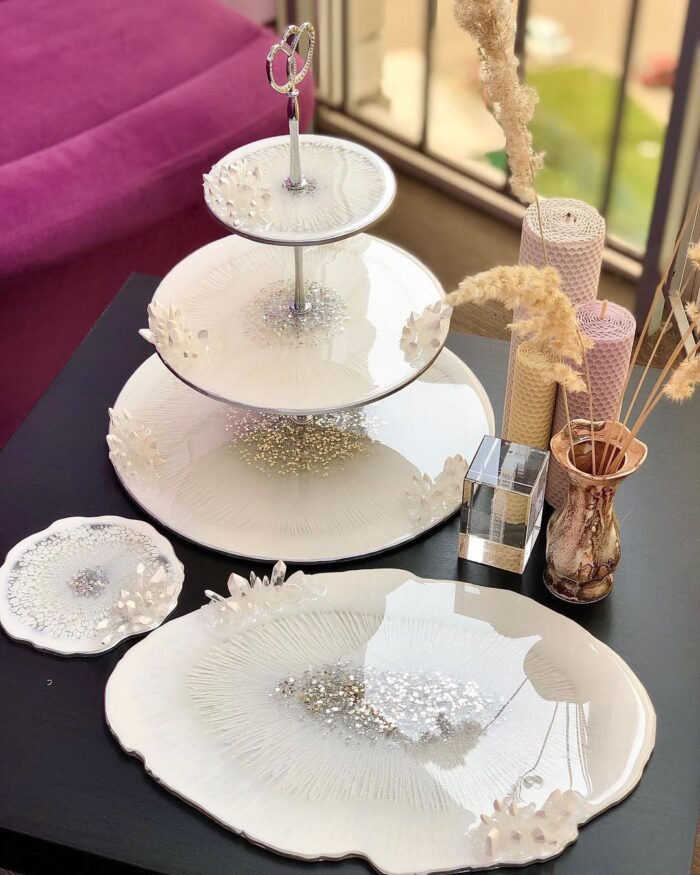 The GlamTier Deluxe Set is a beautifully coordinated 3-piece combo featuring a handcrafted 3-tier resin cake stand, 1 big designer plate, and 1 matching coaster — all finished in high-gloss resin and accented with rhinestones. A premium serving essential by Wedbie, this set is perfect for luxury events, styling, or festive gifting.