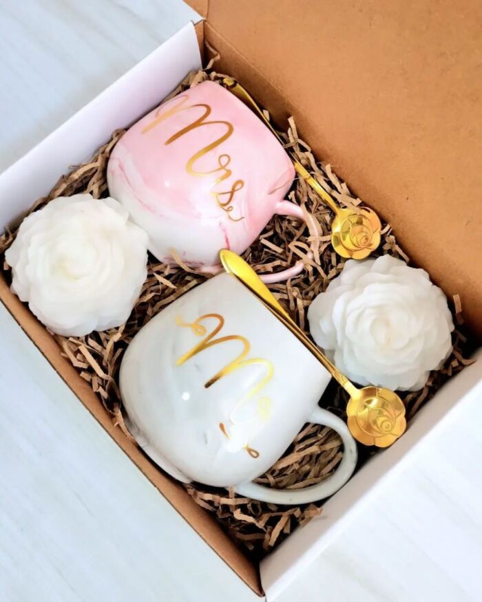Includes: 2 Mugs, 2 Rose Candle,  Spoons