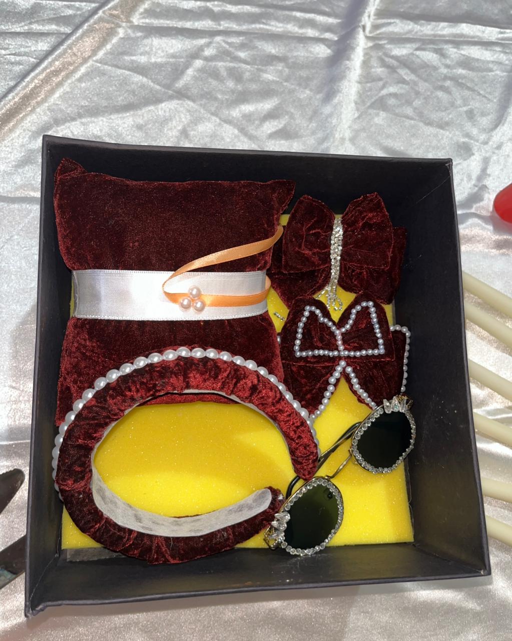 An exclusive wedding hamper featuring a rhinestone ring bearer pillow, chic headband, stylish bows, and sparkling sunglasses—crafted for elegance and timeless charm.”